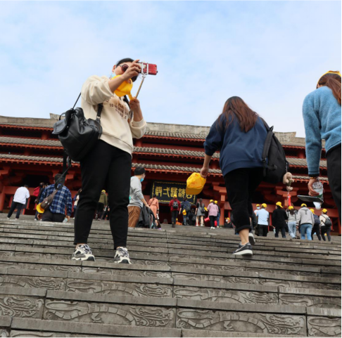 公司员工或三五成群、或数十人一组,在景区游览,亲身体验各种民俗活动,购买丰富多彩的民族工艺品,颇有兴致,其乐融融。